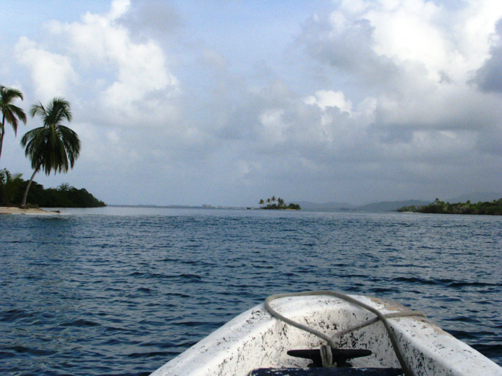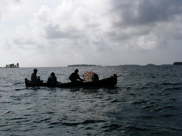 “La brisa marina susurra el nombre y el olor penetrante a sal, a salitre, a herrumbre, a conquista y conquistadores, el exotismo y la historia lo conjugan: Kuna Yala, es como llaman sus nativos a este conglomerado de islas, islotes e islitas flotantes en el azul más azul, más celeste profundo de la cartografía caribeña de América Central. Y kunas, es como a sí mismas se llaman las majestuosas y brillantes artistas y los expertos balseros, amantes de la pesca tanto como ellas del diseño, del color y de la magia caribeña expresada en telas, rumiada y masticada, entre agujas, hilos y vistosas molas* de concepción abstraccionista, ellas y ellos, amos de su Comarca, son los míticos habitantes de esta región limítrofe con Colombia, en el bajo Caribe de Panamá.
