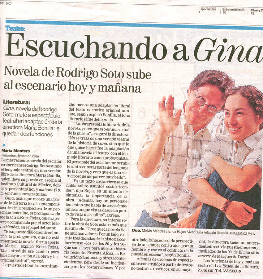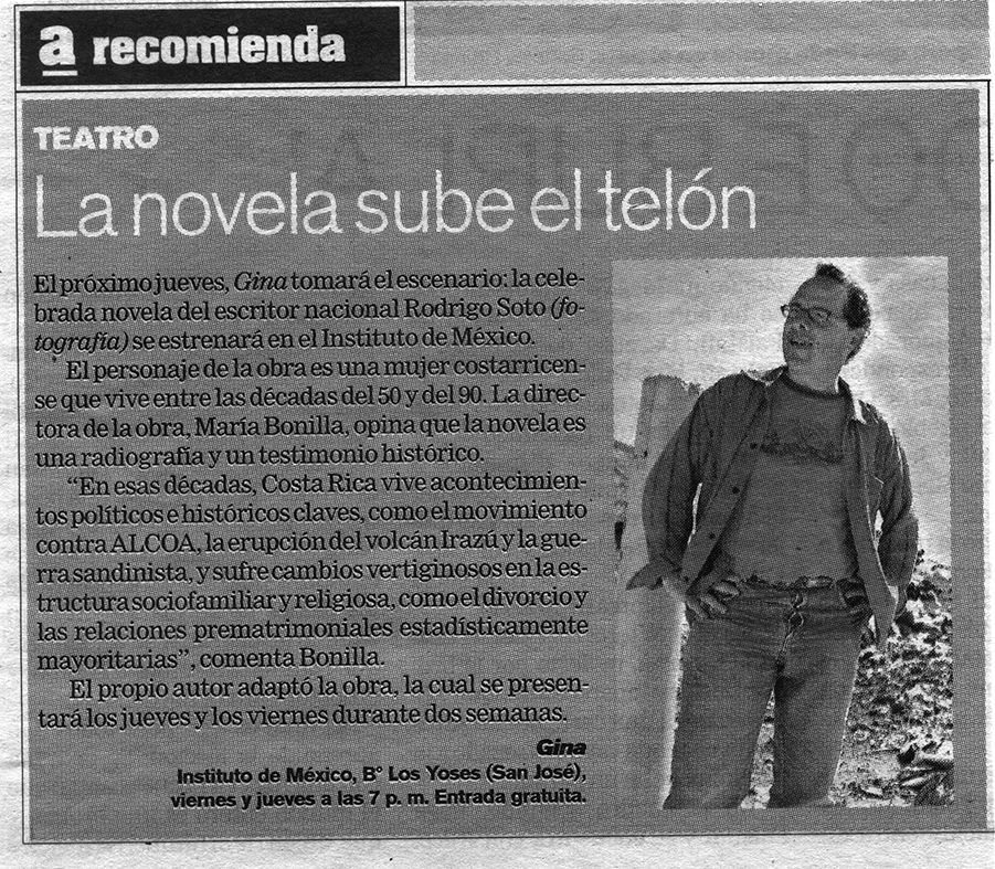 Hace algunos años el destacado escritor costarricense Rodrigo Soto, viejo amigo desde los años de la Universidad, se me acercó para decirme que había escrito un libro inspirado en mí. El libro, titulado Gina, fue publicado en España la primera vez y en Costa Rica dio pie a un montaje teatral dirigido por la escritora y dramaturga María Bonilla; reseñas y comentarios acerca del libro son fácilmente accesibles en la web.